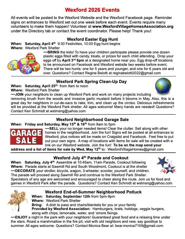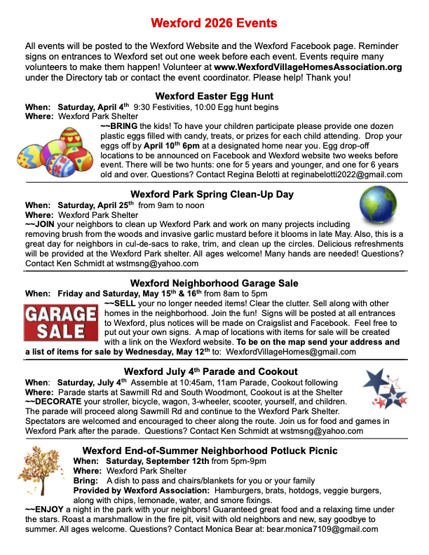 The 2026 Wexford Neighborhood directories have all been delivered! Our last directory was 2017 so this has been a long time in coming. If there are any updates you would like to make for the 2028 edition please notify us using the “Directory” tab at the top of this page. Enjoy!